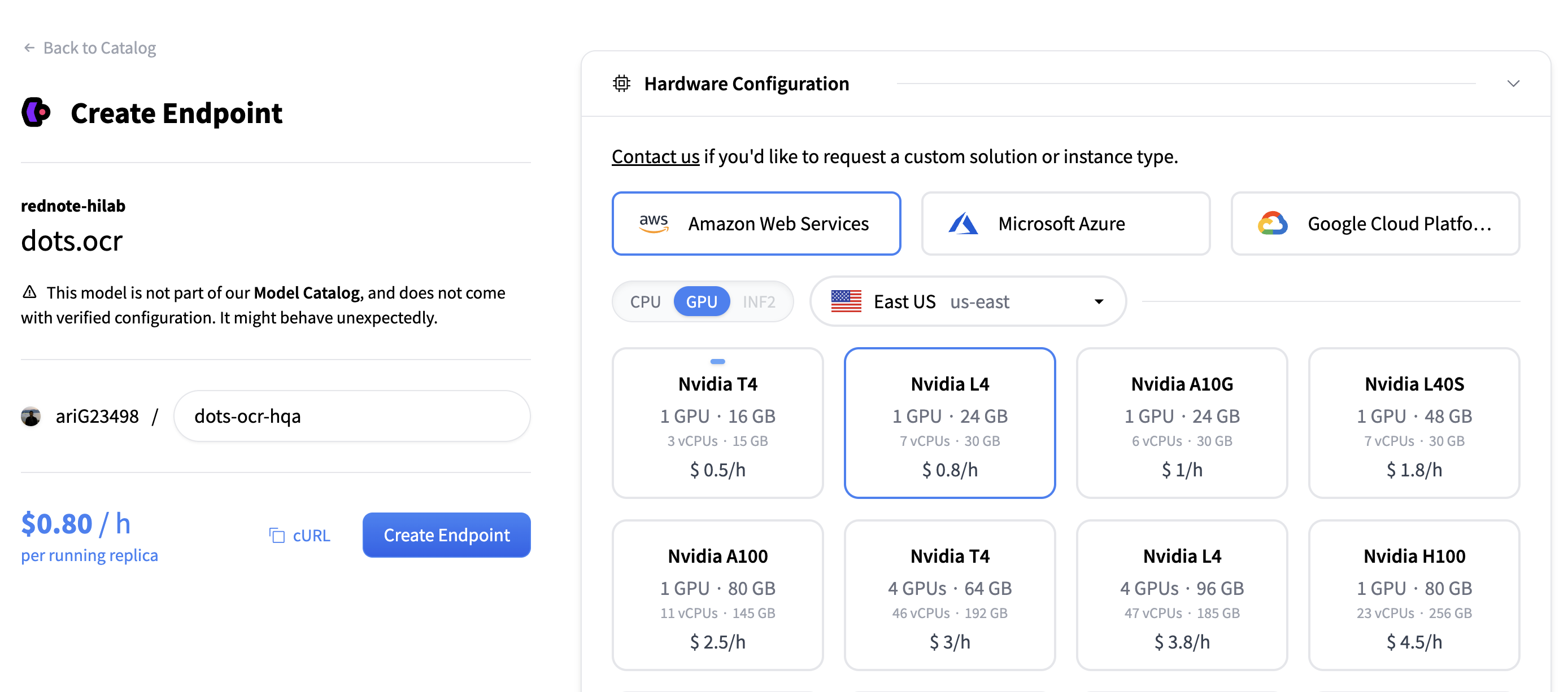 For this demo, we choose AWS and L4 GPU. Adjust according to your hardware needs. -